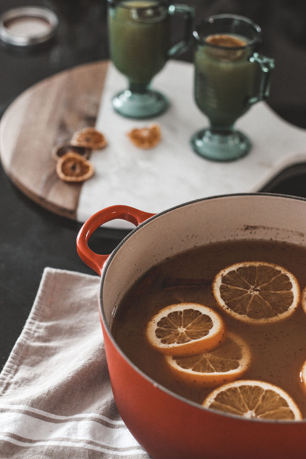 This year, I made dried citrus to decorate with and to use as food and drink garnish, so of course I had to use it as a wassail garnish! If you missed it, here is my Dried Citrus DIY.